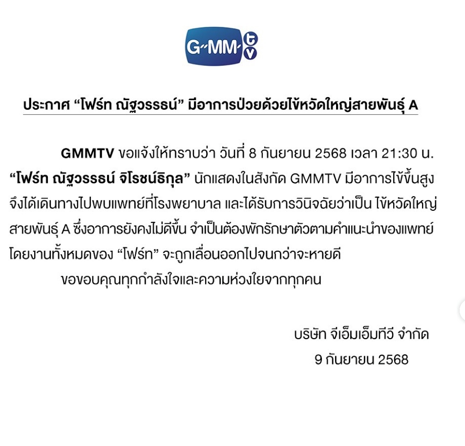 อย่างล่าสุดต้นสังกัด GMMTV ได้ประกาศแจ้งอากาของ หนุ่มโฟร์ท ไว้ประมาณว่า มีอาการไข้สูง จึงเข้ารับการตรวจและได้รับการวินิจฉัยว่าเป็น ไข้หวัดใหญ่สายพันธุ์ A ซึ่งอาการยังไม่ดีขึ้น จำเป็นต้องพักรักษาตัวและเลื่อนงานทั้งหมดออกไปจนกว่าจะหายดี